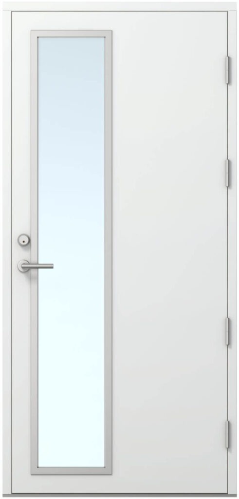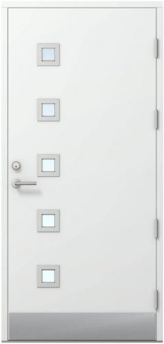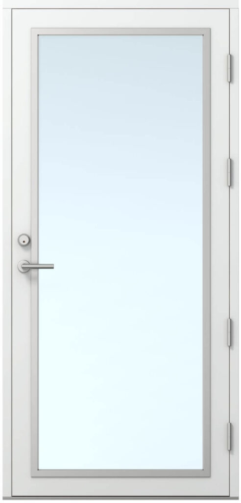 Övrigt: Glaslist av PVC målad i aluminiumnyans. Utvändig 160 mm sparkplåt av borstad aluminium.